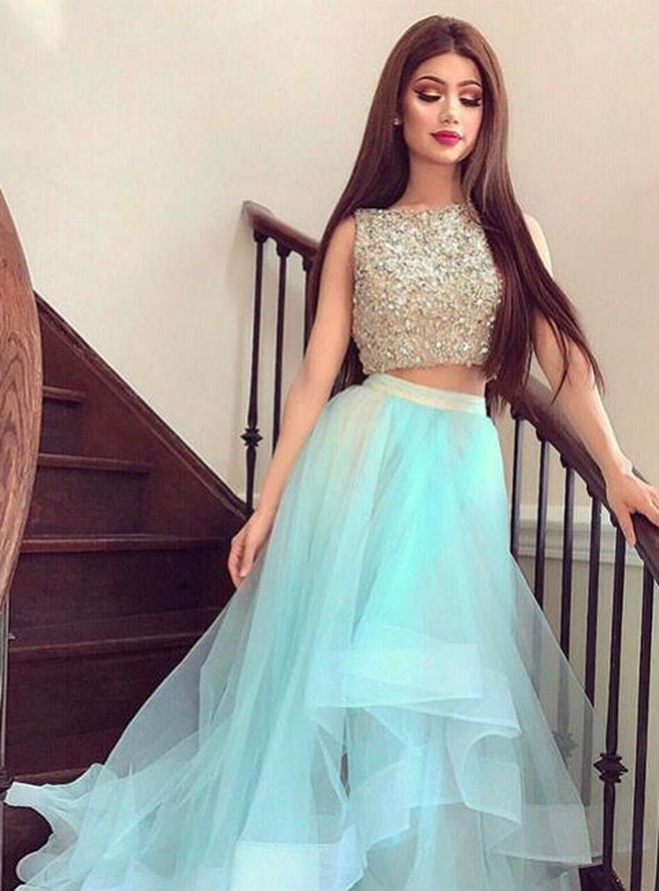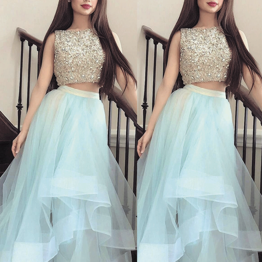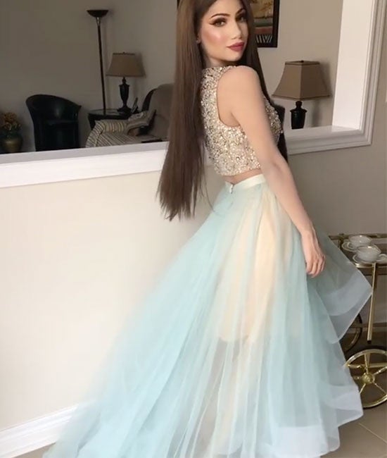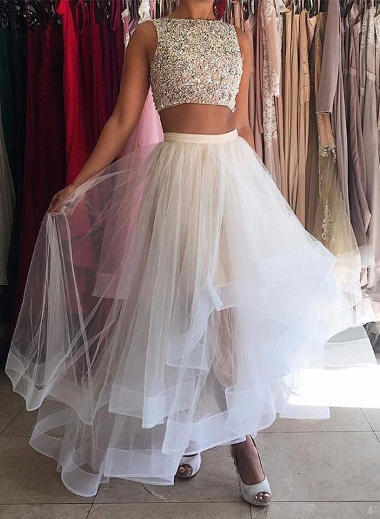 WD0497,Two pieces prom dresses,beaded top evening dress,high low tulle prom evening dresses