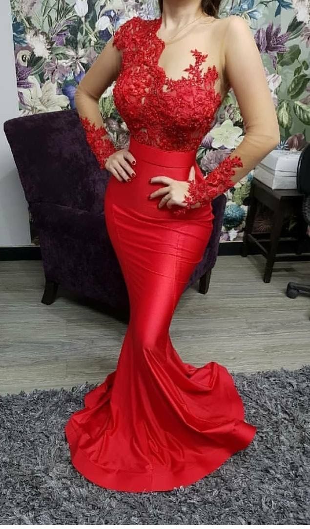 WD0532,Long Sleeve Mermaid Prom Dress Red Appliques Beaded See Through Formal Evening Dresses Plus Size Party Gowns