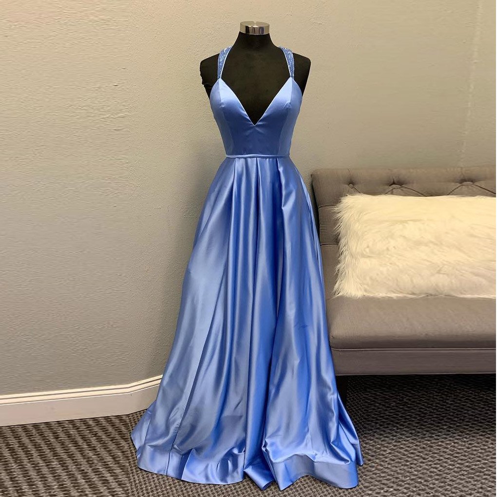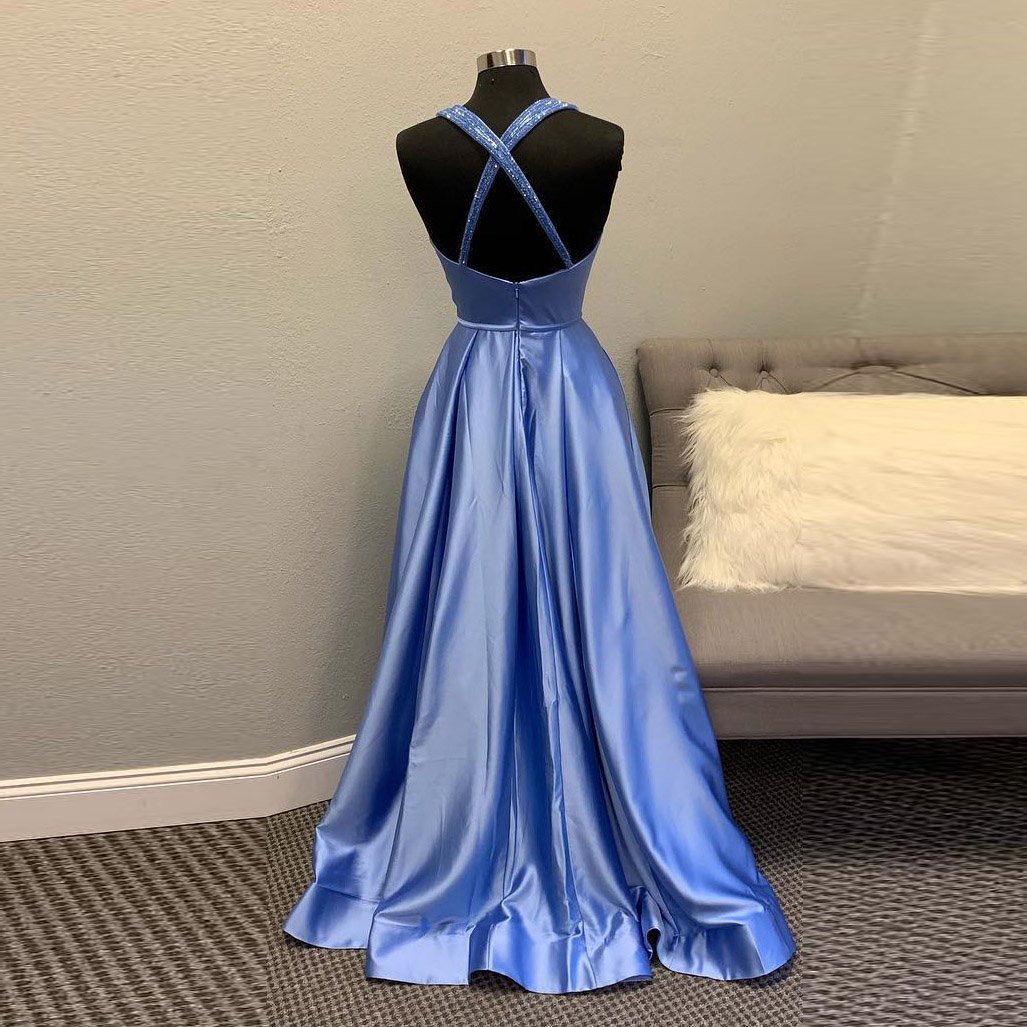 WD0603,A Line Blue Prom Dress Sexy V Neck Open Back Formal Evening Dresses Simple Satin Long Party Gowns