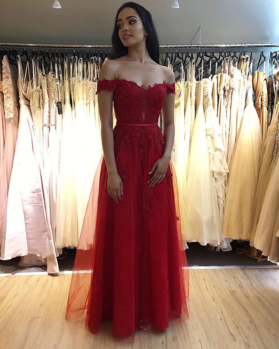 WD0691,Elegant Off Shoulder Red A Line Tulle Prom Dress with Appliques,Floor Length Evening Formal Dress