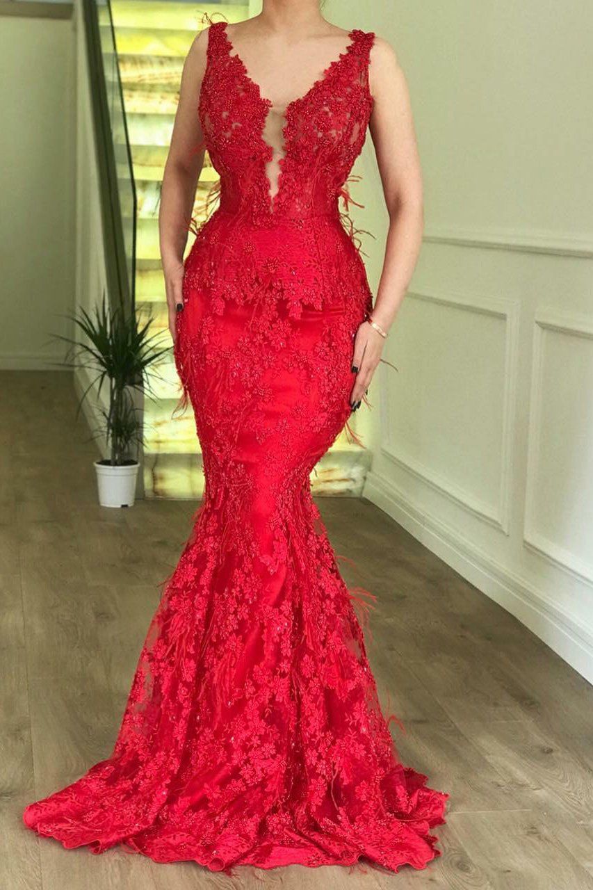WD0844,Sexy Red Mermaid Sleeveless Lace Appliques Evenging Dresses,Mermaid Feather Prom Dress