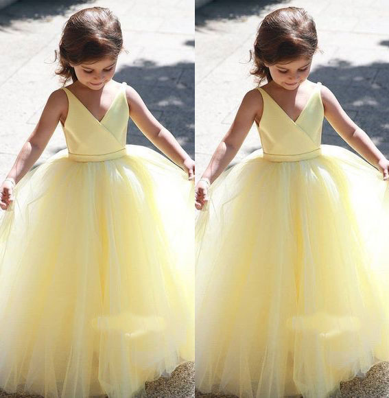 WD0870,Cute A-Line V Neck Yellow Tulle Flower Girl Dresses