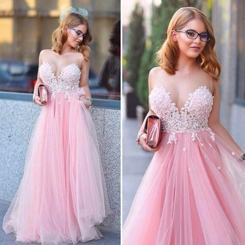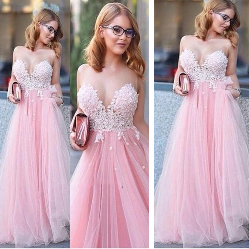 WD0984,Pink sweetheart tulle prom dresses lace appliqur pink evening dress