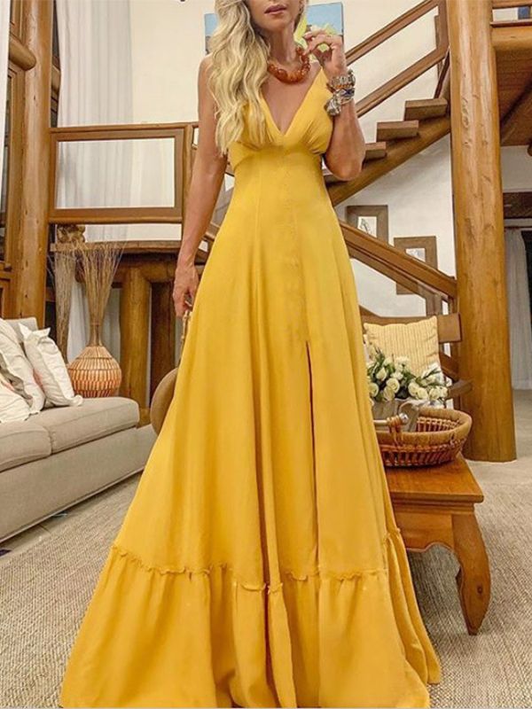 WD1076,Yellow a-line satin prom dresses v-neck sleeveless evening formal dresses