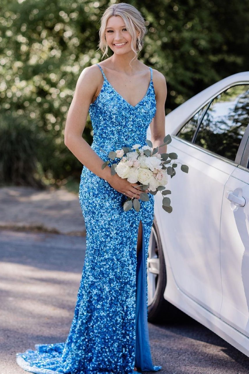 WD1128,Sparkle blue sequin long prom dresses,mermaid v-neck evening formal gown